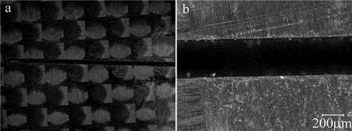 激光功率為60W、重復頻率為0.4MHz、掃描速率為4m/s時,CFRP表面產生的熱影響區如圖 3所示。從圖中可以看出,在切割過程中環氧樹脂基體材料回縮,而表層碳纖維增強體并未被去除而裸露出來形成熱影響區。這是因為環氧樹脂氣化溫度為700K,而碳纖維T300的氣化溫度為4000K,所以當激光能量不足夠使碳纖維氣化而僅僅只能使環氧樹脂氣化時,氣化的環氧樹脂被輔助氣體吹除,碳纖維保留在切縫兩側裸露出來形成熱影響區。
