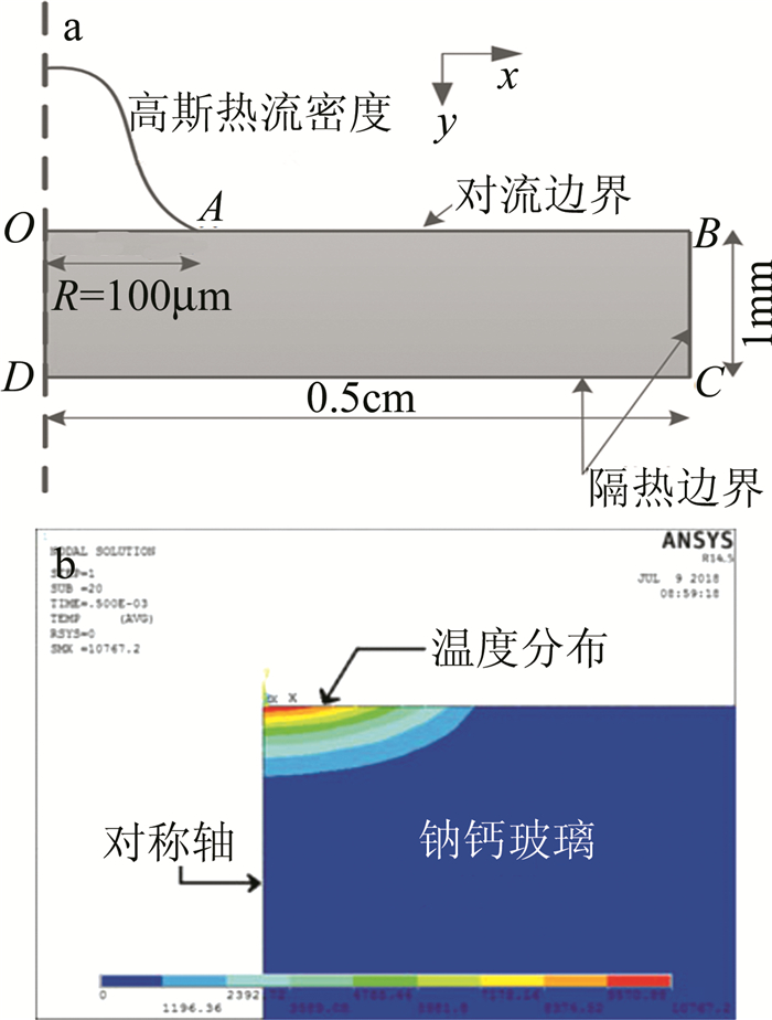 a—2維對稱瞬態傳熱模型b—單次激光脈沖后的溫度分布