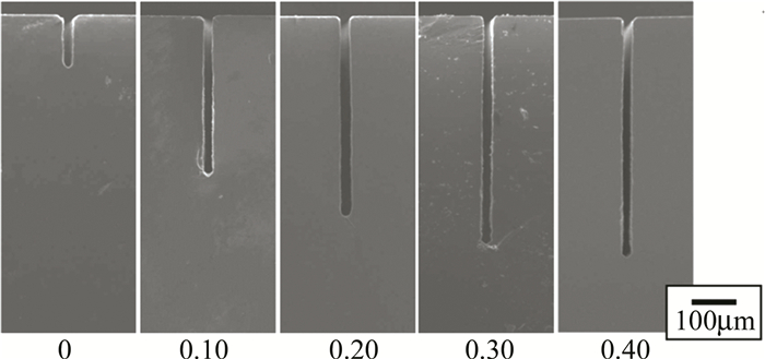 對于激光誘導背部濕法刻蝕,溶劑材料種類和激光工藝參量的選取都對刻蝕質量有較大的影響。EHRHARDT等人以甲苯溶液為液體介質,采用355nm和266nm的皮秒激光對石英玻璃進行刻蝕,發現甲苯溶液中芘的含量對去蝕率有較大影響,且在一定范圍內芘的含量越高,去蝕率越大。KWON等人提出在使用波長為1064nm、脈寬為100ns的近紅外激光刻蝕鈉鈣玻璃的過程中,可通過在吸收劑中加入磷酸抑制裂紋的產生,通過對比不同磷酸質量分數(0~0.40)的吸收劑刻蝕效果(如圖 5所示)發現,加入磷酸后,可刻蝕深度提高了約5倍(從103μm提高到530μm),且側壁的粗糙度從0.55μm下降到0.16μm;此外,通過調整溶液中的磷酸濃度,可以制備出多種不同形狀及深寬比的微通道。SUN等人利用飛秒激光分別在空氣、水和乙醇中加工熔石英玻璃,結果表明,以乙醇為吸收介質時,熔石英玻璃的燒蝕閾值從2.22J/cm2降到了1.02J/cm2,進一步研究發現,刻蝕時乙醇比水需更低的激光能量便能達到形成等離子體的電子密度,同時激光誘導等離子體形成后會在液體中產生氣泡,酒精中的氣泡比水中的對石英表面的沖擊壓力更大。
